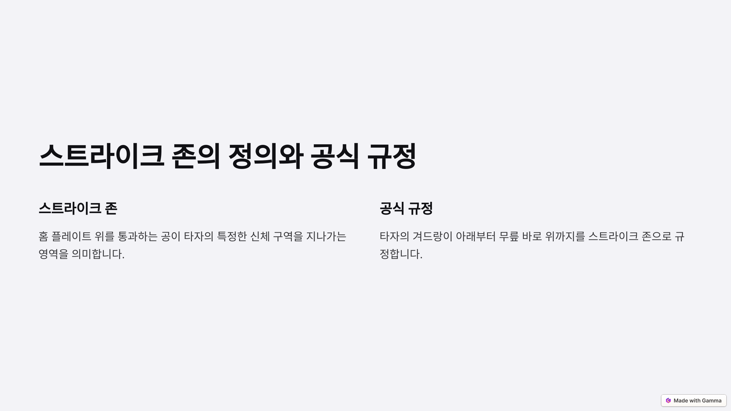 스트라이크 존은 홈 플레이트 위를 통과하는 공이 타자의 특정한 신체 구역을 지나가는 영역을 의미합니다. 공식적으로 타자의 겨드랑이 아래부터 무릎 바로 위까지를 스트라이크 존으로 규정하고 있으며, 이는 선수의 신장에 따라 유동적입니다.