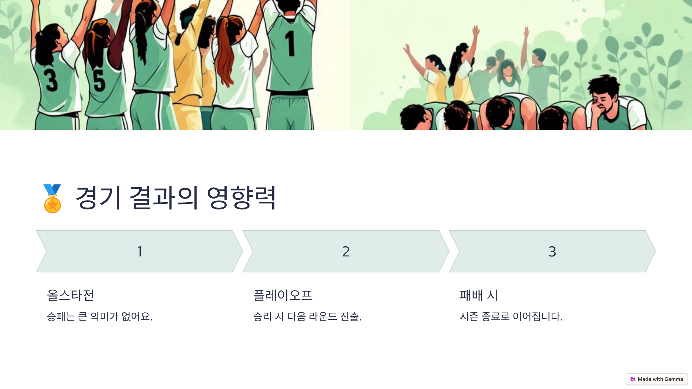 반면, 플레이오프는 오직 성적으로 승부! 정규 시즌 성적이 좋은 팀만이 출전할 수 있어요. 인기가 많아도 실력이 부족하면 플레이오프엔 갈 수 없어요.